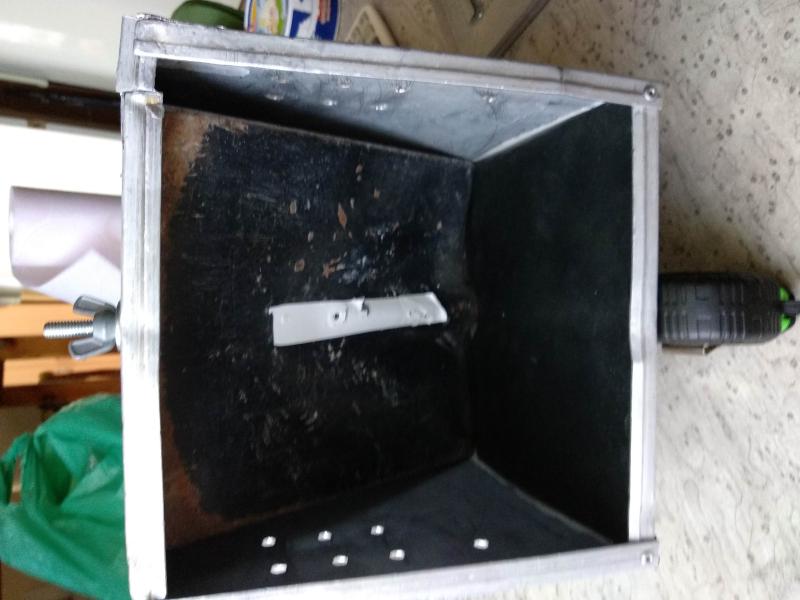 Ayer probé el tema de la plancha a 45°. Tenía una pala de cavar rota y la apañe para ponerla. Como la caja es de aluminio y se marcaba la base, le puse una pieza de goma abajo.