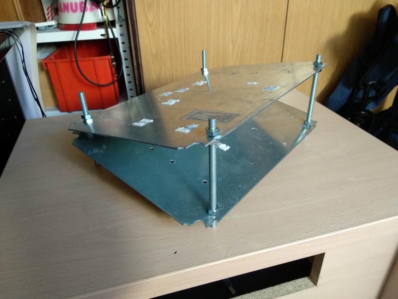 Basándome en que las pruebas pasan por distintos ángulos de impacto y que hacer un modelo con cada cambio en los grados de las planchas es un coñazo, se me ha ocurrido hacer esto, una plataforma que puedo graduar la medida de la entrada y salida alterando el ángulo de impacto del perdigón.