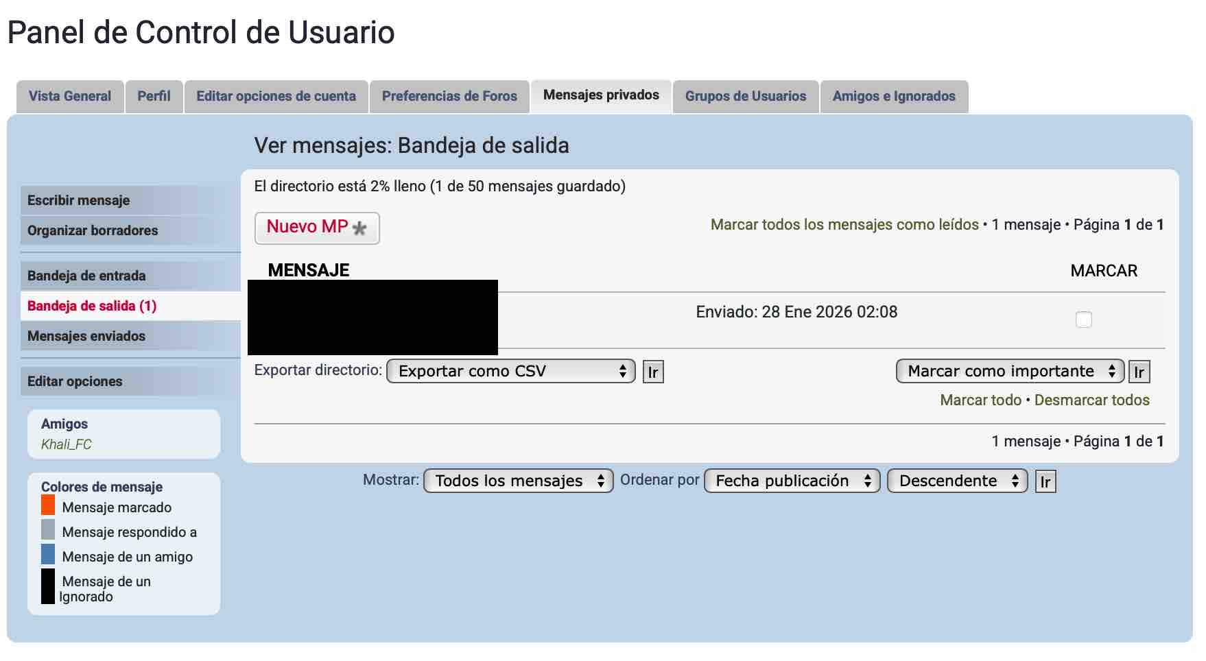 1.- cuando mando un privado, se me queda en rojo en bandeja de salida, es así, o tengo que pulsar algún botón que no encuentro. Gracias. VISTO, al leerlo el destinatario sale de la bandeja de salida y pasa a Enviados, creo.