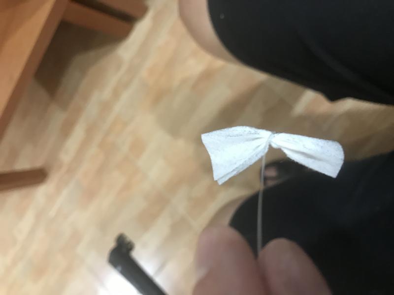 Para el hilo, lo pongo doble y hago un nudo en el extremo, después hago otro 3 o 4 nudos a lo largo del hilo para que tenga más fuerza y no se doble al pasarlo por el cañón, tal cómo aparece en la foto.