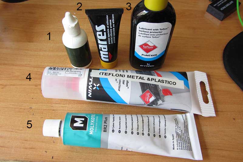 2-Grasa de silicona de submarinismo, muy espesa..la uso más bien poco. Del decartón y es barata