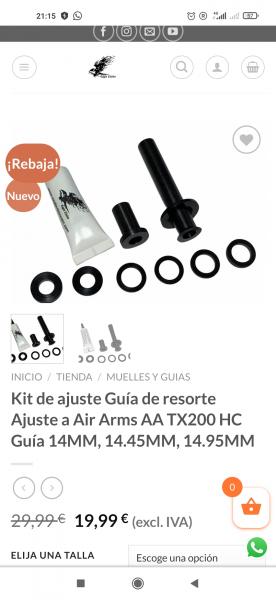 Hola buenas, refloto el hilo. Necesito comprar recambios básicos para una BAM B40 (clon de la TX200) y no consigo encontrar por ningún lado. Hablé con Mundilar, que hasta ahora tenía todo para la TX y para mi sorpresa me dicen que han dejado de trabajar con Air Arms y que ya no van a traer nada de esta marca. Alguien sabe de alguna otra tienda?? A este paso me parece que le voy a dar una patada a esta carabina y me voy a quedar con mis Weihrauch, que no dan tanto por saco... Un saludo!!