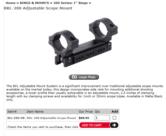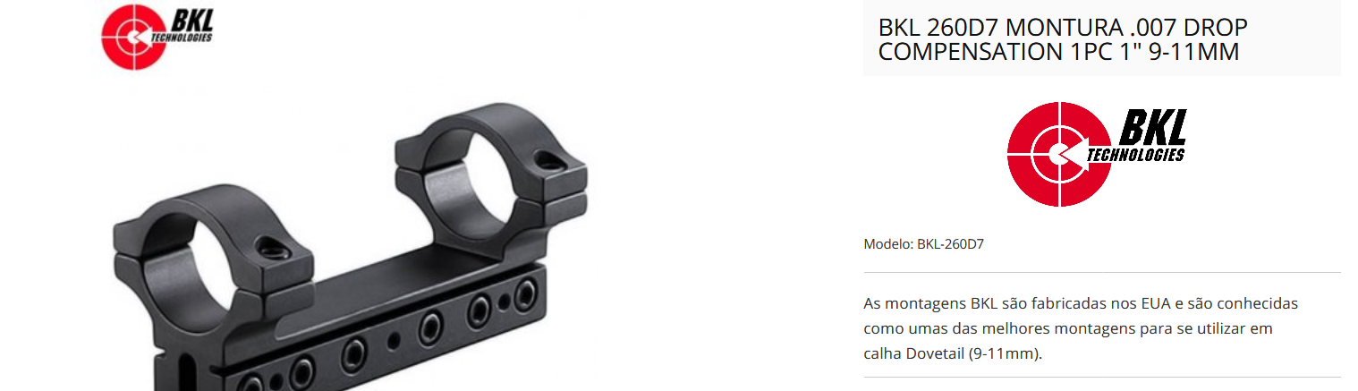 El sistema de montaje ajustable BKL es una mejora significativa con respecto a los montajes de alcance ajustable tradicionales disponibles en el mercado hoy en día; este diseño incorpora rieles laterales para montar accesorios de disparo adicionales, un perfil más bajo de lo que normalmente se puede lograr en un soporte ajustable, 2,5 pulgadas de longitud de sujeción con seis tornillos de sujeción y disponibilidad para tubos de alcance de 1 pulgada o 30 mm. Disponible solo en negro mate.