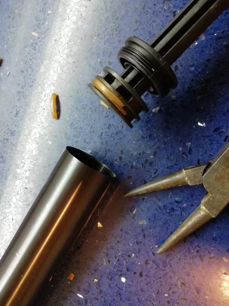 Para cambiar la torica del piston, si tu pistola es de la primera serie lleva el cilindro roscado, veras que en la parte del eje la tapa tiene dos agujeritos para meter unos alicates de puntas o similar y desenrroscarla, si es de la segunda serie veras que por los lados lleva un agujero con un pasador, despues de sacarlo sale la tapa estirando.