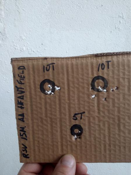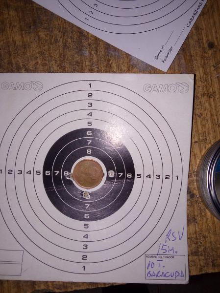 Como os decía hoy e sacado la carabina desde hace muuuchos dias y me dispuesto a probar los rws club (muy ligeros,en esta carabina no los habia probado los utilizo para la expo). Sin calentar muelle primero in grupo de 10 arriba a la dcha. Luego go otros 10 arriba a la izda. y abajo 5. Mi idea era hacer 10 también pero por motivos de tiempo y queaceres en casa asi a quedao hasta que tenga mas tiempo disponible para practicar y probarlos mas a fondo.