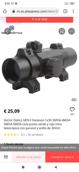 Compañero Mate88, me da que te va a salir bueno, además, tiene varios tamaños de punto, aunque el menor es de 3 moa, y 5 niveles de iluminación, por lo que tanto si tiras a poca luz como a pleno sol, no tendrás problemas para ver el punto, que solo se ve mirando por el visor. Suerte amigo, y que lo disfrutes