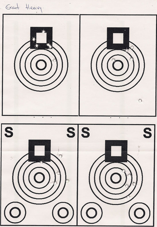 en fin, he probado con los barracuda match y power, exact y exact heavy, gamo ts-10, y norica thor, y pongo fotos solo de los barracuda match y ambos exact, que han sido los mejores. he usado blancos de br50 y disparado cinco veces al circulo central.