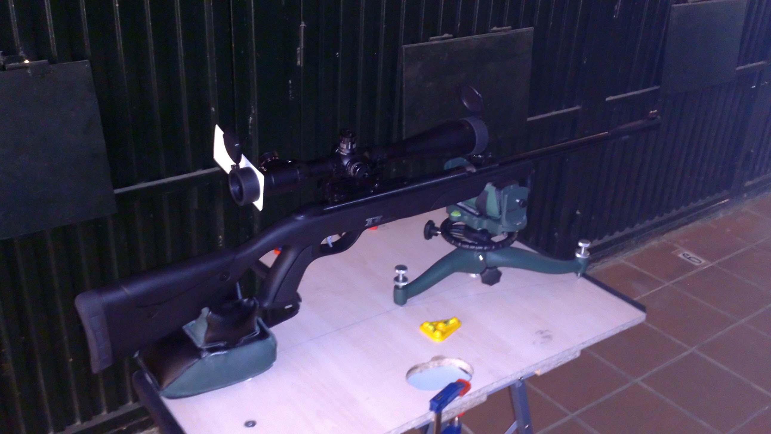tire sobre mi mesa, torreta y saquete de br50. la carabina estaba bien firme y, haciendolo con cuidado, apenas se movia al apretar el disparador. el visor lo tenia a tope de aumentos, 32.