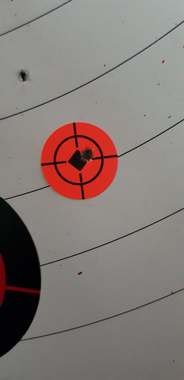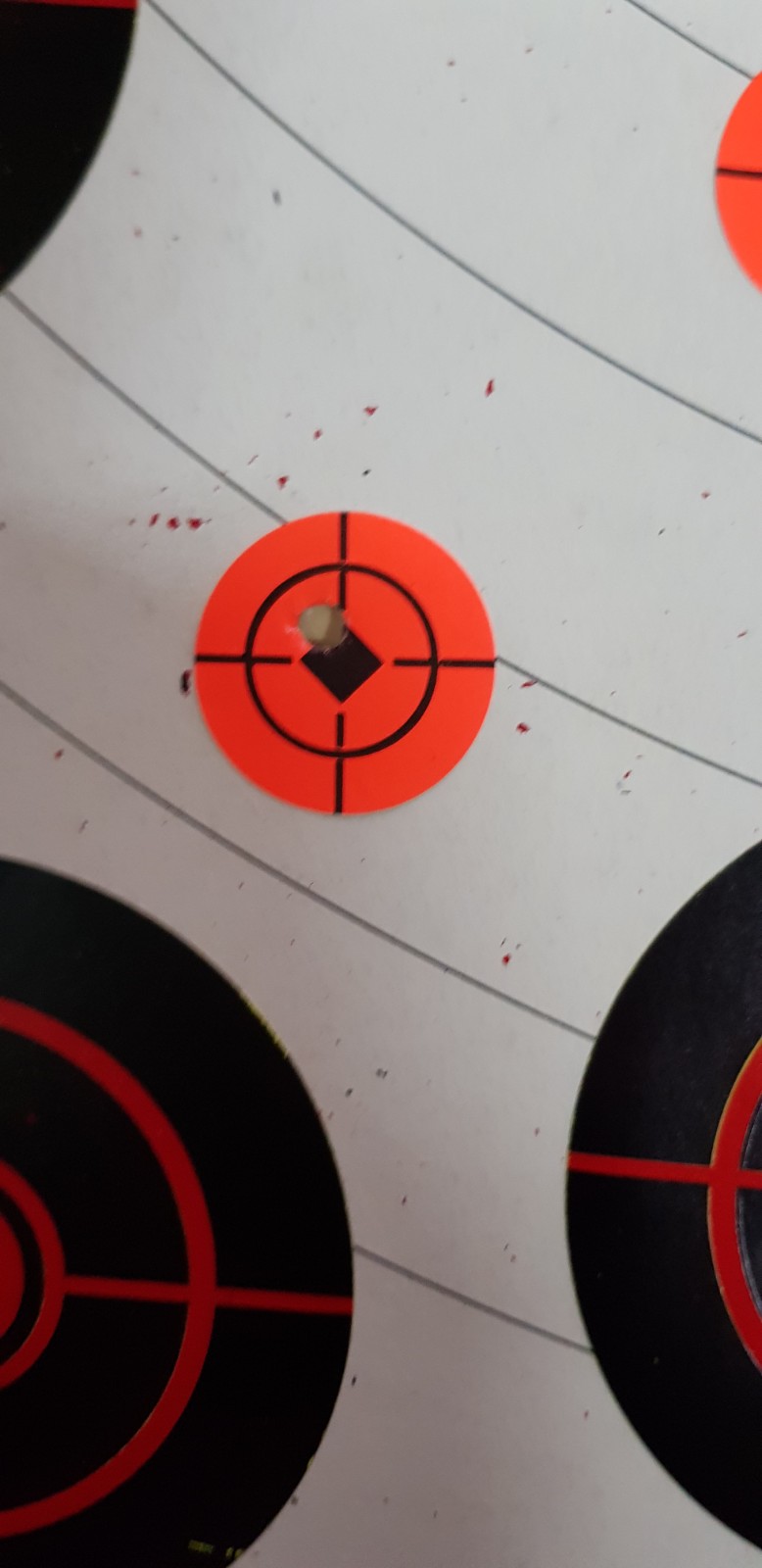 Hola compañeros, buenas tardes, tarde de satisfacciones a tope en 50 metros, 5 disparos me costó ajustar casi del todo bien el visor, mañana a ver si me da tiempo y lo dejo totalmente centrado, después de ajustar medianamente tenía que apuntar a las 5 al borde de la diana según reloj, no quise retocar más por que me quedaba sin luz diurna, pero bueno, no estuvo mal. Unas fotitos