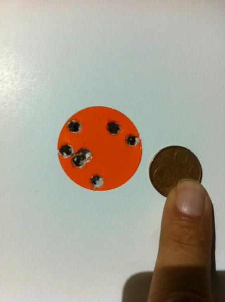 y unas fotos de unos grupos realizados con esta carabina a 50 metros , tal cual viene de casa , nada se ha tocado , el visor un Arcea de 32 aumentos mildot, el apoyo el de siempre un cadwel matrix y la municion Jsb King,