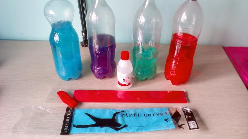 Ponemos unas tiras de papel crespon en una botella de 2 litros, vertemos un poco de alcohol en el fondo, un poco de agua y removemos bien, lo dejamos dos minutos y rellenamos con agua, listo…