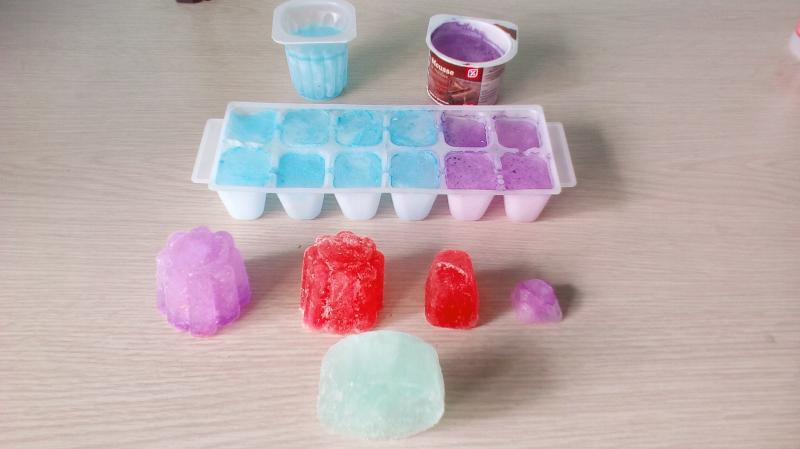 Este es un poco mas elaborado pero también muy agradable de usar, los cubitos al reventar hacen un sonido característico y el darle colorido los hace mucho mas vistosos, el proceso para conseguir agua de colores es sencillo y aquí vienen muy bien los niños otra vez.
