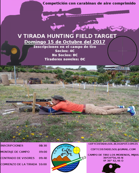 El próximo domingo, 15 de Octubre celebraremos en el CDFT Costa del Sol la V TIRADA HUNTING FIELD TARGET de nuestra liga. Como siempre, se realizará en nuestras instalaciones, en el campo de tiro Los Morenos, en Mijas (Málaga).