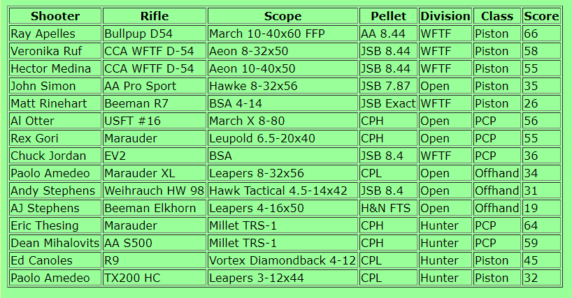 Estoy completamente de acuerdo, pero a veces, ni con un visor Deon de 80 aumentos, de precio, unos 5.000 y pico dolares en USA, que para comprarlo aquí, habría que vender un riñón, y una carabina super sofisticada pcp USFT Mac 1, de casi otra tanta pasta, con este pedazo de equipo, se lleva un baño de cuidado, por un señor con una Diana 54 con culata bullpup artesanal, una simple escopetilla de muelle, sacandole 11 puntos en el campeonato USA del año 2014, y no estamos hablando de aficionados, si no verdaderos campeones mundiales de FT. En cualquier deporte que uses cosas, el equipo es importante, pero no lo principal, y en este caso, la puntería y los cálculos bien hechos, son imprescindibles.........