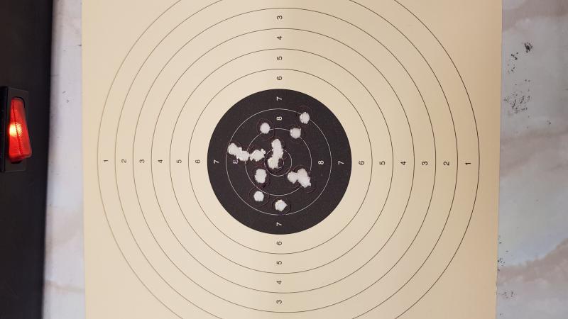 Hola, por mi experiencia puedo opinar de la Stinger Ares y comprobé que es potente, y el pero que le note es que a mi no me resultaba cómoda su empuñadura, no pasa lo mismo con la SPA que la tiene un tanto anatómica y se adaptaba mejor a mi mano, pero si te adaptas a la e la Stinger puedes hacer muy buenos disparos. Ahora y desde el 25 de diciembre estoy disfrutando muchísimo de la Weihrauch HW 40 , expreso mi opinión, y nunca había disparado con una pistola que me brindara la precisión y la regularidad de la HW40, todo ello por 135 €. Estuve usando la Compact de Gamo durante unas 10 jornadas de tiro y tiene la empuñadura muy adaptable a la mano y además regulable pero está por los 250/260 euros, casi el doble que la HW40 y no acabó de encajar a mi gusto, también he tirado con la PR45 de Gamo, empuñadura parecida a la HW40 (alrededor de los 150 €) y me gustó pero no tanto, y la Baikal que cita Iván (aprovecho para enviarle un muy cordial saludo), está cercana a los 500 € aunque tengo leído que se llevó un campeonato mundial de tiro con aire a 10 metros, la he probado y me resulta bastante pesada. En fin, expresé todo desde mi experiencia en las pistolas con las que he tirado. Pongo dos fotos con tiradas de ayer sábado por la mañana a 8 metros y con apoyo (diana con centro rojo de 14x14) para tener clara la precisión de la pistola y no de mi pulso