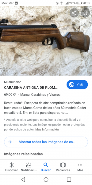 MarianoP escribió:Hola, necesito vuestra ayuda para identificar una carabina GAMO del 5,5 que me acaban de regalar. Llevo días buscando por Internet, pero veo varios modelos "parecidos" por eso os pido ayuda. Os adjunto unas fotos. Me gustaría saber algo de ella, año de fabricación, potencia ...