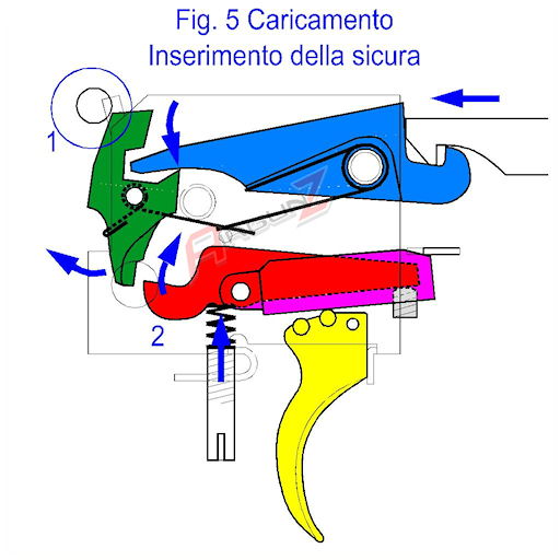 El seguro es muy eficiente porque creo que sujeta la pieza verde dejando el gatillo loco y se acciona "automáticamente" con la palanca de carga, pero, al menos en la mía, no siempre se acciona porque para que se accione hay que tirar de la palanca de carga hasta que haga tope, si te detienes en el primer clic que oigas se queda el trinquete sujetando el pistón y lista para disparar pero sin el seguro echado. Es un modelo bastante antiguo, no se si todas serán iguales.