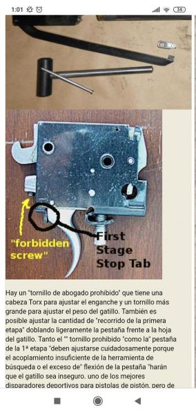 Imagino que girando este tornillo en un sentido u otro darás más o menos recorrido al primer tiempo o etapa del gatillo, pero no me ha quedado muy claro si es así de simple o hay algún otro tipo de ajuste que estoy dejando pasar.