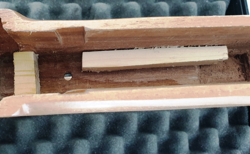cuando tiré de la palanca de carga, la acción se movió en el culato, cuando apreté el perno en el culato, el gatillo se atascó y no se puede mover hasta que la acción se mueve en el culato con la mano. Me puse en contacto con el creador sobre esto para preguntarle si debería haber algo para espaciar las cosas dentro del rifle para que pueda apretarse, me dijo que agregara algo. Tuve que agregar la pequeña madera que ves adentro para poder apretar el culato.