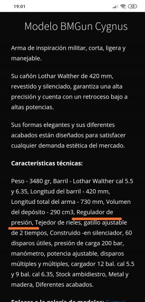 Tal vez el compañero Daz vio el anuncio en el portal de compra-venta Milanuncios, en el cual no pone nada referente al regulador de presión...en cambio, en la página web del fabricante sí que lo pone...y tal vez él se decantó por este arma debido a esa descripción, no se, un tanto raro el precio de las primeras Cygnus que aparecen en la página web, más del doble que las dos últimas unidades que aparecen al final de la página, en todo caso, al menos es una información un tanto confusa del arma....