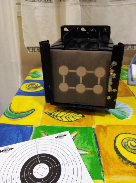 Chapa de 2mm galvanizada., pintado en negro por reflejos del sol. Los impactos son algunos de 7j y otros de 20j a una distancia de 15m. Alguno a 10m lo dejo sobre un taburete de bar ó colgado en una escarpia.