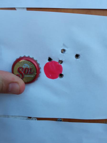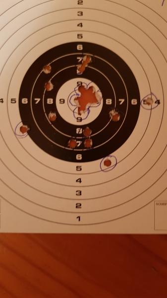 Hola, buenas noches, pues vamos de puntos rojo. No hace mucho ya hubo un hilo referido a los puntos rojos en el que se expresaba los diferentes usos que la gente le daba a estos visores, yo en pistola no tiro decentemente si no es con el red dot, tengo dos pistolas y 3 red dot, y digo 3 por que con el primero había veces que me costaba un poco encontrar el punto, y compré uno "holo", con 2 intensidades de iluminación, pensando que tendría más facilidad en encontrarlo, después de varios días tratando de adaptarme al holo y compararlo con el primero habiéndome adaptado a este bien, llegué a la conclusión de que debía guardar el holo y comprar uno idéntico al primero, que tiene 11 intensidades de brillo, ahora no quiero otro, las pistolas en las que están puestos son una Weihrauch HW40 de 4.5 y una SPA CP1 de 5.5 , estoy muy muy contento con estos visores, que cada uno me costaron unos 17€ , y hago tiro de precisión a 10 metros tirando a dos manos, alguna vez pruebo con una sola mano y no me salen mal del todo pero prefiero con las dos manos. Adjunto 2 fotos de esta tarde con la HW40 a 10 metros, no todos los tiros son buenos, pero bueno, quedo satisfecho. Esto es para dejar claro que con los red dot se puede divertir, incluso haciendo precisión, aunque no de mucho nivel