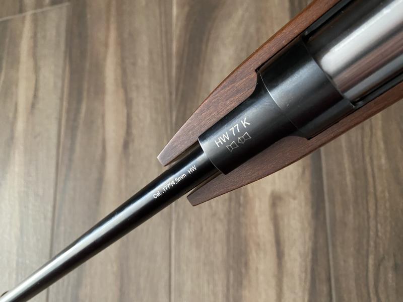 El caso es que en el modelo HW77K de fecha 2023, me sorprendió bastante al esperar ver el modelo grabado con punzones de presión (troquelados como si se tratara del número de serie grabado en el cañón) ver un grabado a láser con un tono próximo al dorado del detalle del modelo, los dibujos del sentido del balín y las palabras "cal..177*/4,5mm HW", sinceramente me decepcionó bastante al no conocer tal extremo y verlo por primera vez en mi carabina, supongo que a cada persona le sentará de una manera u otra ver este tipo de detalles (todas ellas respetables claro está), pero dedico este tiempo escribiendo estas línea por si a alguna persona que sea de fijarse en minucias como lo soy yo, no le pille por sorpresa.