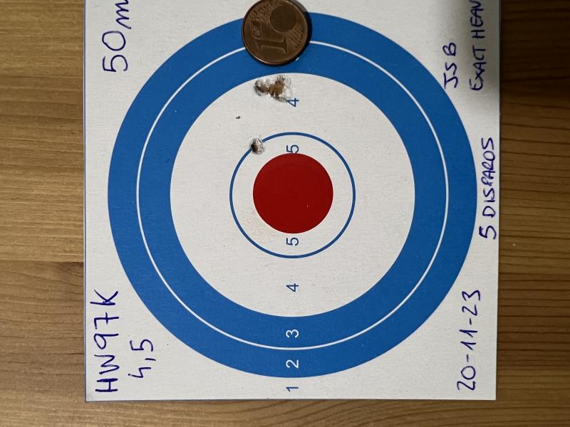 Sólo quería compartir con vosotros lo que es capaz de hacer una HW97K del 4,5 en campo de tiro abierto a 50 metros de distancia y sin seleccionar ningún balín (cogidos directamente de la caja sin pesar). El visor, un UTG a 24 aumentos.