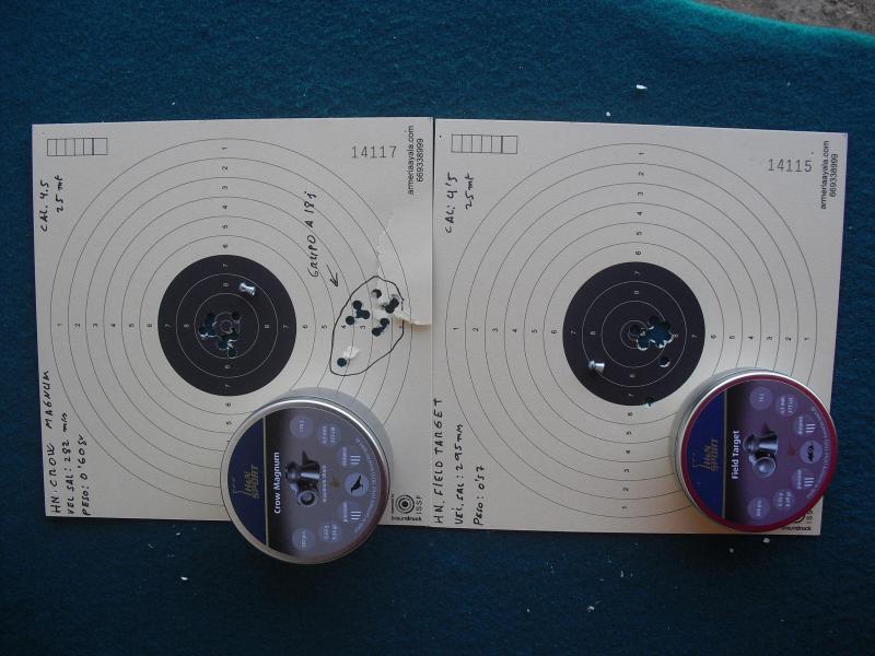 Las peores agrupaciones a esta distancia fueron las realizadas por estos dos balines : HN Crow Magnum ( creado tambien para la caza ) y HN Field Target :