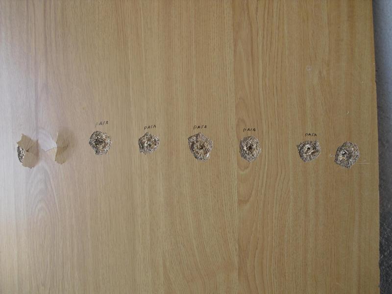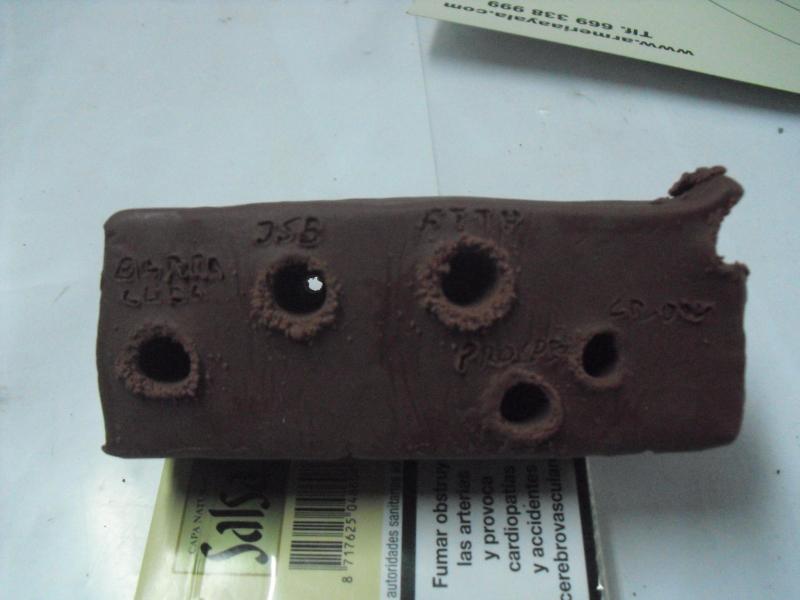 Quise tambien probar la capacidad de penetración a 25 mt sobre un taco de plastilina y sobre una tabla de aglomerado de 1,5 cm de ancho.