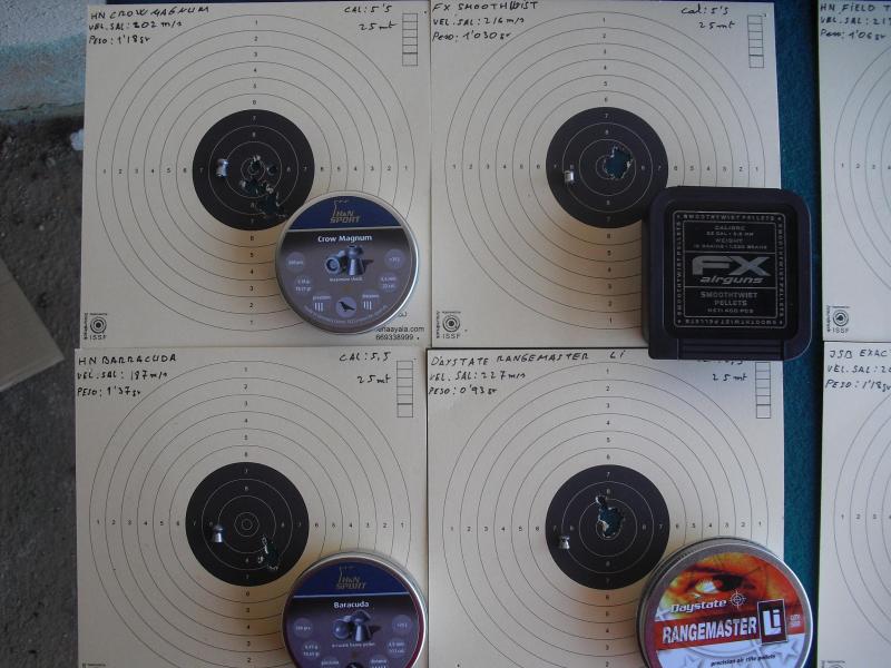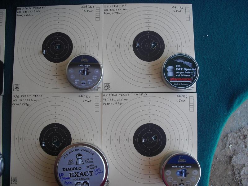 Las mejores agrupaciones a 25 mt con el cal. 5,5 fueron conseguidas por el HN Field Target Trophy( con unos alucinantes 8 mm ), el HN Field Target ( 12 mm ) y el Weihrauch F&T ( 13 mm ):