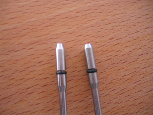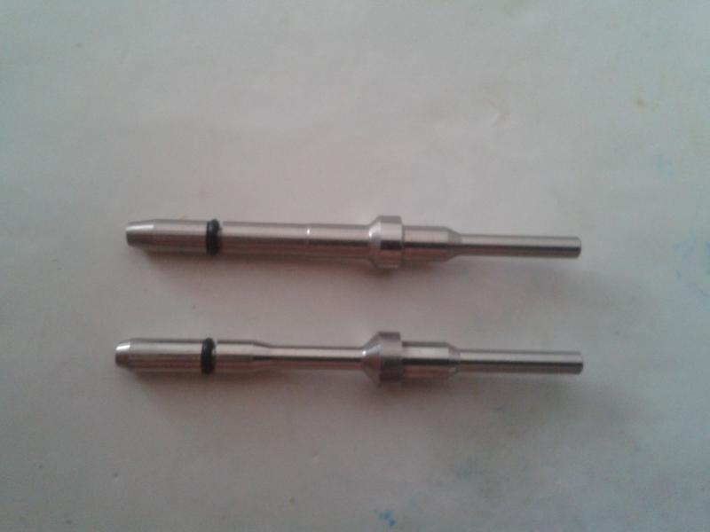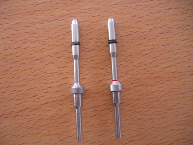 pongo una foto de dos agujas de at-44,la de derecha es la que compré a un compañero de aqui hace poquito a esa le quiero rebajar...pero en que zona debo de hacerlo? y cuanto mas o menos...entre las dos rayitas rojas que hice? ahí tiene un diámetro de 2.60mm,en cuanto tengo que dejarlo? y si tengo que rebajar en otra zona tambien.