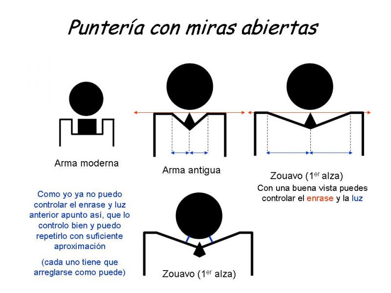 Cuando se trata de armas de avancarga la cosa cambia. No hay planos paralelos entre punto y alza, ni horizontales ni verticales. Asi que dependiendo de la forma del punto uno ha de buscar lo que le resulte más cómodo a su vista que le permita reproducir el disparo cada vez. Yo ya tengo la vista muy "perjudicada", y me resulta mas cómodo ver el punto escondiéndose en el vértice de la "V" que enrasado con los planos superiores de la misma. En el zouavo el alza es una V con mucho ángulo. Con mucho esfuerzo podría intentar dejar su extremos superiores a la misma altura que el punto, pero al mismo tiempo controlar que la "luz" a ambos lados del mismo sea igual... para mi es muy dificil. El disparo me sale mucho mas centrado de la otra forma, y la altura la controlo, algo con la carga (menos de lo que uno quisiera) y más con el punto exacto donde apuntar. En mi caso la tangente inferior del negro (tal como yo la veo).