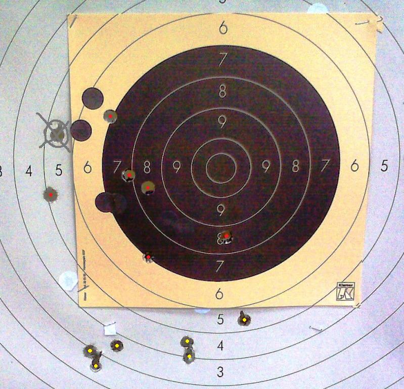En ambos casos se apuntó a pulso a pié de negro, marcado en rojo la SWC de 200gr y en amarillo la bola de .454"