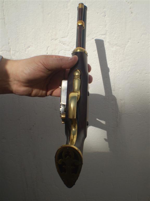 La pistola Catalana es calibre .50, tambien se pueden hacer en el calibre que deseen. En calibre .50 estamos usando una carga de 25 grains de la polvora que hay en este pais que es marca Inkael, varia mucho con las polvoras que usan ustedes alla. El origen es: pistola Catalana