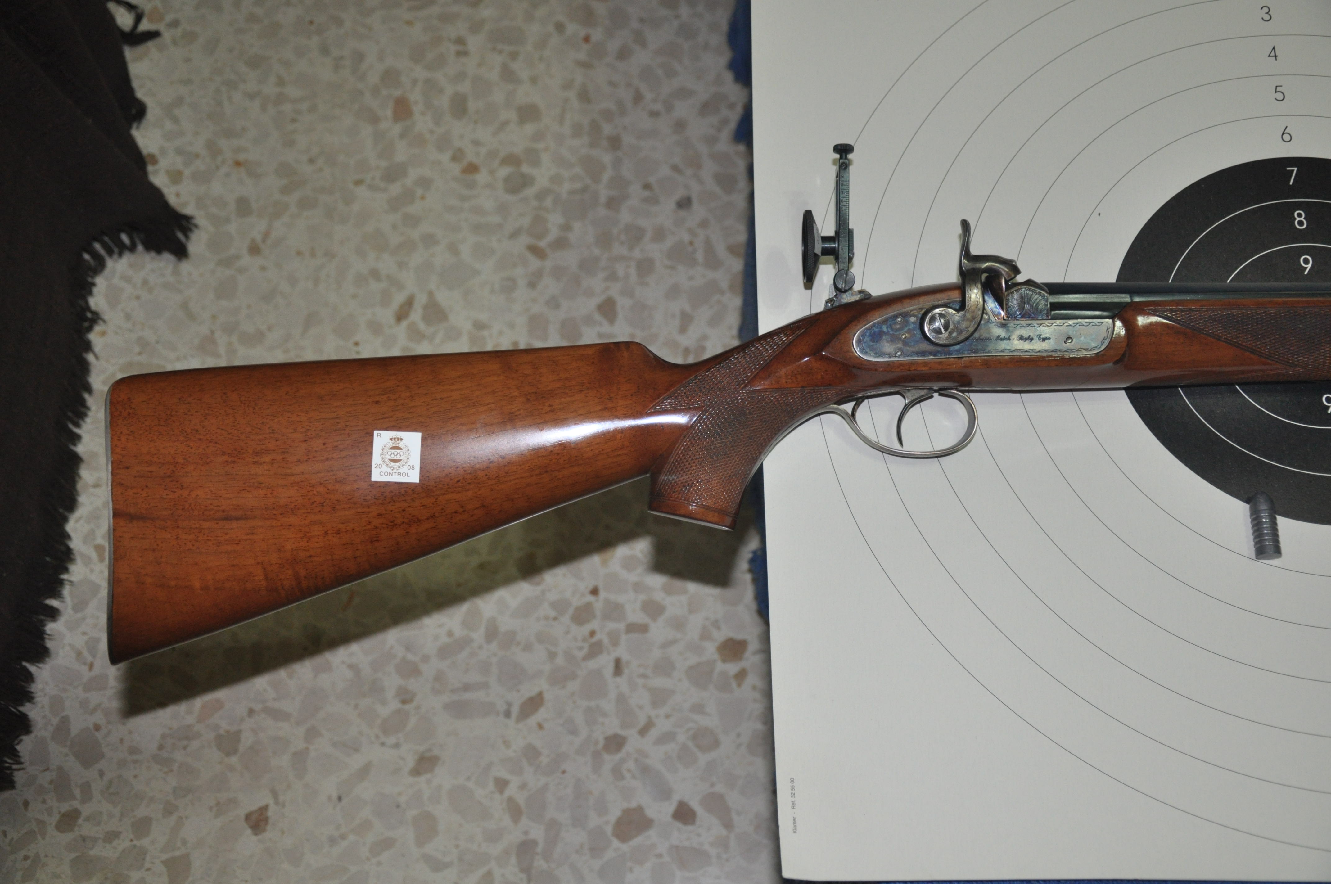 Mi arma larga favorita es un Kodiak Express cal.54 de Pedersoli con diopter ajustado al primer cañón, con miras abiertas balea un tiro a menos de una mano del otro, sin cruzarse ni variar la altura,8-9 a las 3 y a las 9...Africa, la India, el Gran Norte...me hace soñar, la precisión y la competición para mí son secundarios, para eso tengo otras armas(Springfield 1861, Remington 700ML visor 3-9x, Hawken 32" cal.45, incluso mi nueva carabina Scout cal.32 de Pedersoli).