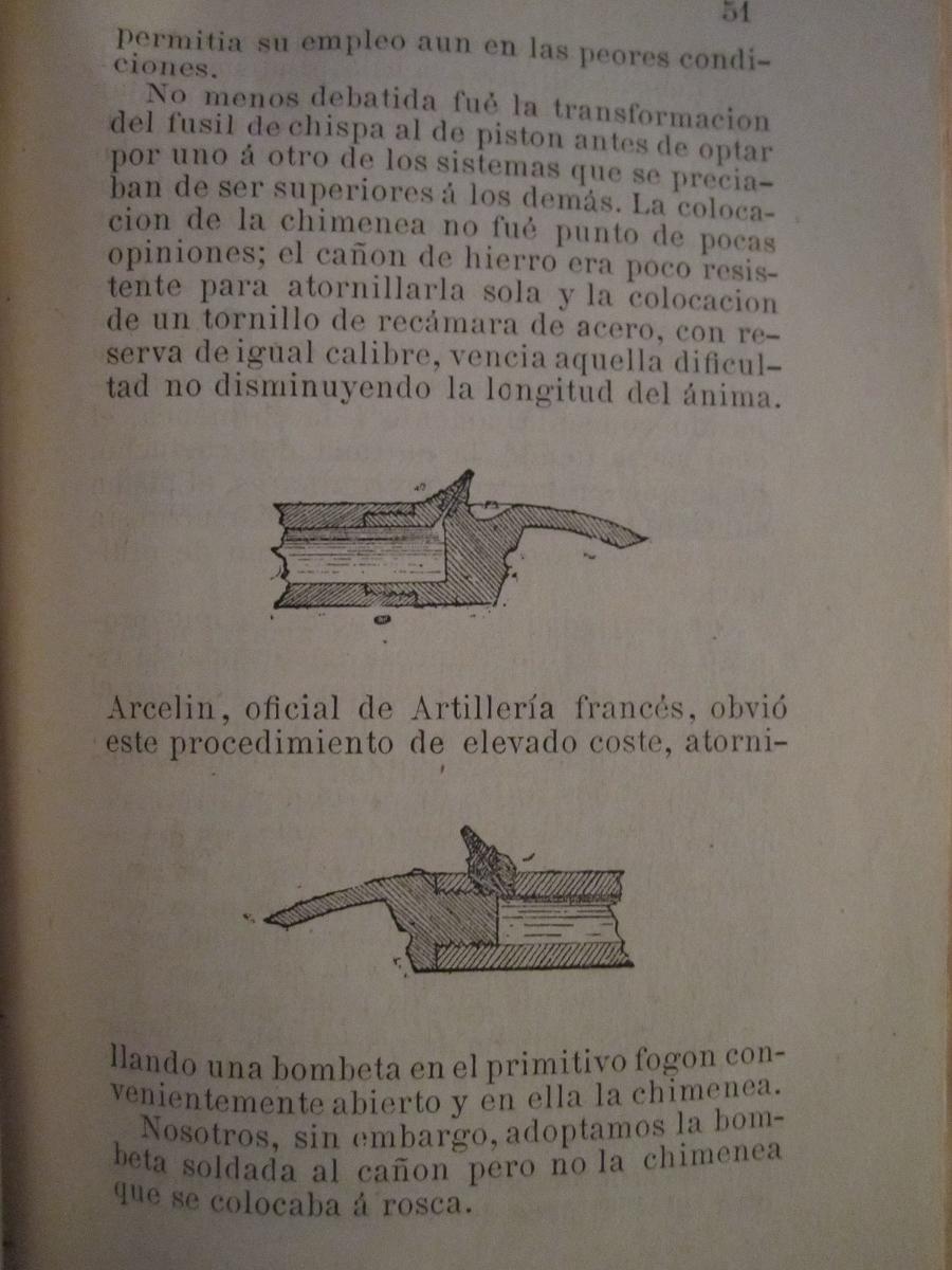 No menos debatida fue la transformación del fusil de chispa al de pistón antes de optar por uno u otro de los sistemas que se preciaban de ser superiores a los demás. La colocación de la chimenea no fue punto de pocas opiniones; el cañón de hierro era poco resistente para atornillarla sola y la colocación de un tornillo de recámara de acero, con reserva de igual calibre, vencía aquella dificultad no disminuyendo la longitud del ánima.