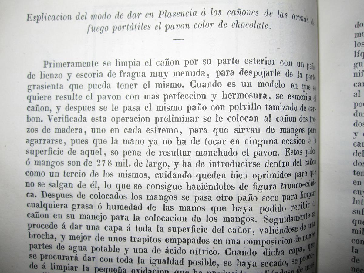 Modo de usarlo. Se principia por poner el cañón perfectamente limpio y seco; en seguida con un hisopo o trapito se unta con esta disolución, se coloca arrimado a la pared, y el cañón principia por tomar un color verdoso que se vuelve rojo al secarse. Cuando se haya ya perfectamente seco, para lo que necesitan transcurrir veinticuatro horas, o más si la atmósfera está cargada de humedad, se frota el cañón con un cepillo fuerte, y en seguida se le pasa un paño que le deje limpio de todo el polvillo que el cepillo había desprendido. En este estado y acto continuo vuelve a untarse con la misma disolución, y del modo ya indicado vuelve a colocarse vertical hasta que se halle totalmente seco de esta segunda mano, y se repite otra vez la operación del cepillo y el trapo. Generalmente hay necesidad de repetir estas operaciones de seis a siete veces, que ocupan en tiempo seco el mismo número de días, al cabo de los cuales se encuentra el cañón perfectamente cubierto de un color achocolatado, y en este estado se mete en agua caliente, en donde permanece de 4 a 5 minutos, y se seca perfectamente con un lienzo ligeramente mojado en aceite de linaza secante. A las cuatro o cinco horas se quita con otro lienzo este aceite secante, en seguida se le da una capa de aceite común, con o que queda terminada la operación.