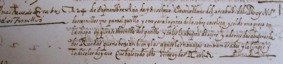 …Se hiço En vna llave del arcabuz del Rey N Sr dos tornillos Vno para el gatillo y otro para la pieça de la sobre caçoleta y solde una pieça en la chapa en que ase el tornillo del gatillo y calçe la agujeta deaçero y adereçe dos agujeros de dos Ruedas queno benían bien….