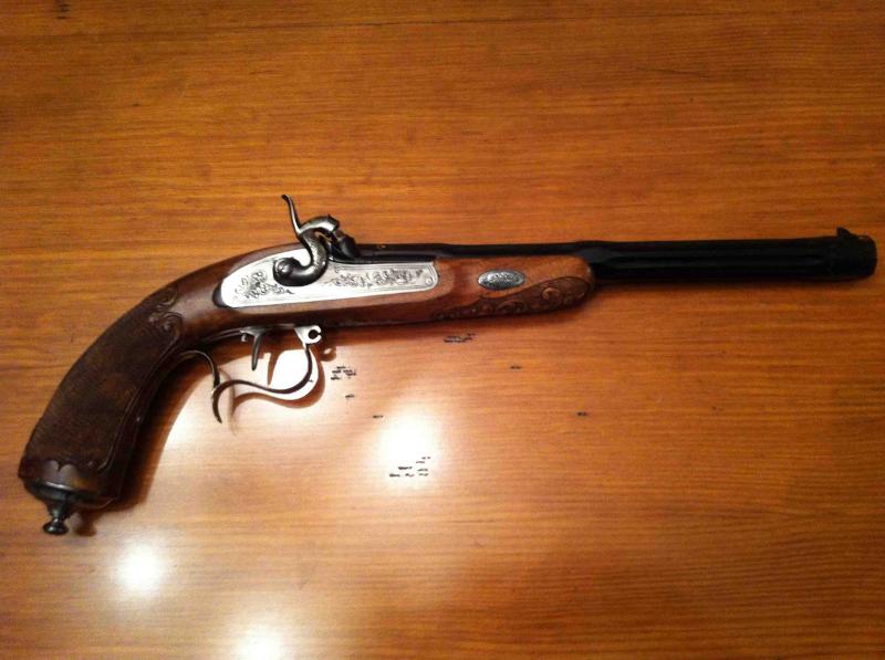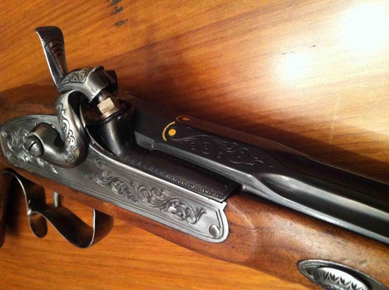 Pistola de duelo Gastinne Renette (fabricada por ARSA, ésta en su versión lujo con incrustaciones de oro y grabados en madera a mano).
