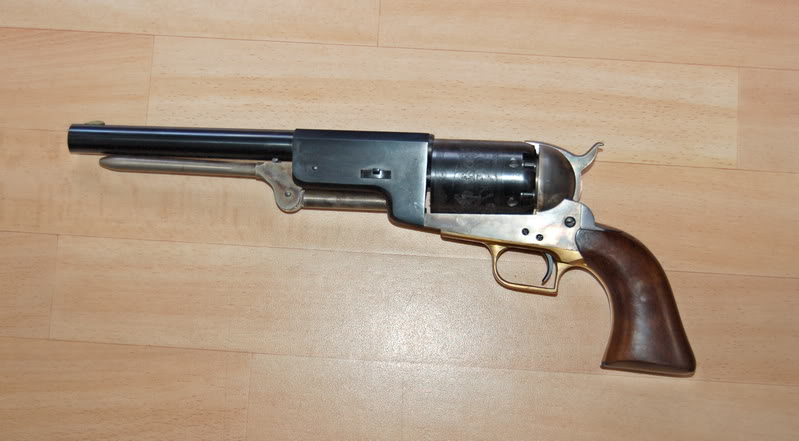 - .36 or .44 cal. perc., 7.5 in. octagon barrel, (roll) engraved cylinder, color case hardened frame and loading lever, silver plated brass backstrap and square back trigger guard. Sheriff´s Model has 5 in. barrel, brass trigger guard and backstrap. Disc. 2000.