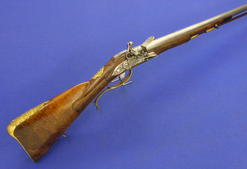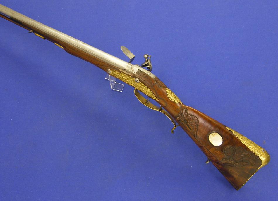 A very nice probably German Flintlock Rifle, circa 1750, caliber 16 mm rifled, length 138 cm, in mint condition. Price 2.700 euro