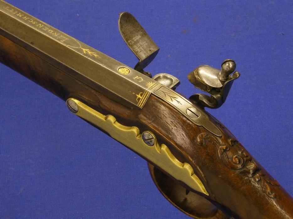 A very nice 18th century German Flintlock Gun, signed LINDENSCHMITT A MAYENCE(Mainz), caliber 15mm smooth, length 120, in mint condition. Price 2.850 euro