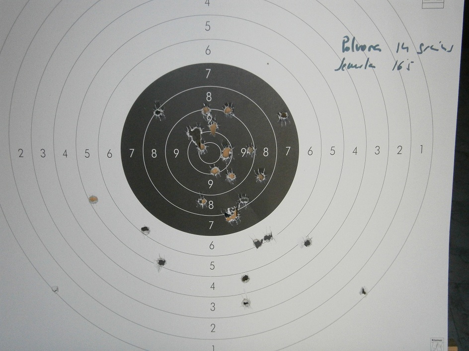 La primera es la del artilugio para dosificar la polvora, una jeringuilla cortada con la que ajustas el volumen que quieres. La otra tiros hechos con 13 grains de polvora y 16 de semola. Y la última que se me aparecio la virgen con 14 grains de polvora y 16 de semola.