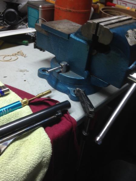 La primera fue la realiación del punto de mira de las fotos,que me dio tela de lo lindo.Despues de terminarlo vino el trabajo de colocación,el cual no fue muy complicado:colocacion de dos tacos de madera en el tornillo de mecanico para prensar el punto de mira sobre el rebaje.Todo bien y perfecto.