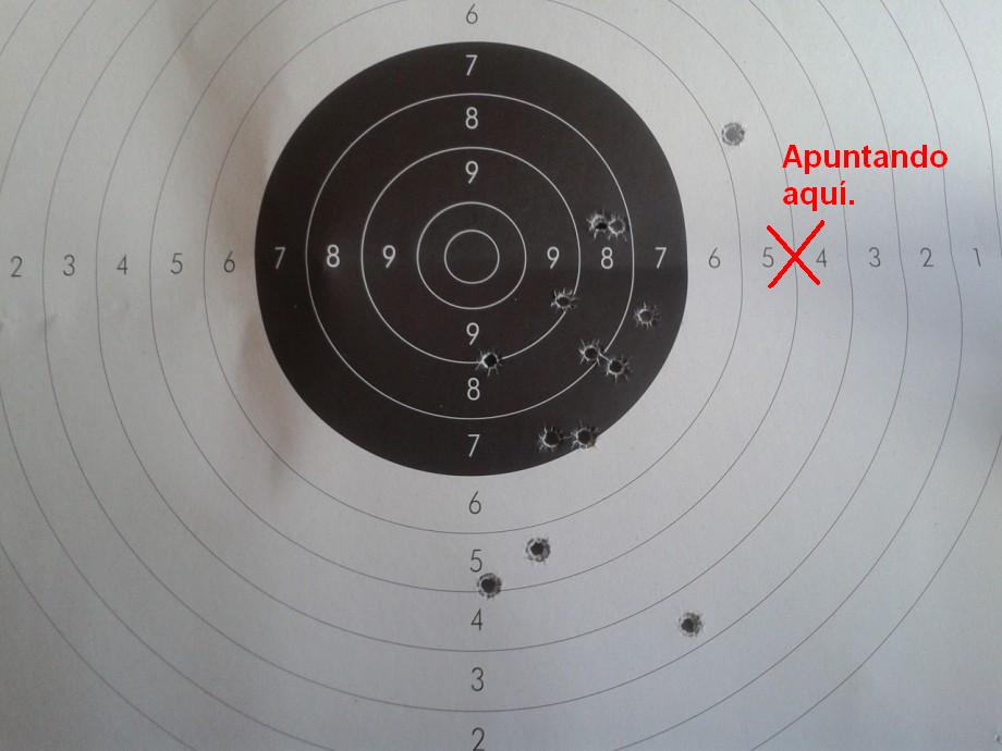 El bicho tira a la izquierda y algo bajo, tirando a pie de diana ya he visto que tendría que apuntar algo a la derecha para meterlas en el negro y lo he hecho donde indico, aunque me he pasado un poco y debería haber apuntado al 7 a la derecha. Como eran los últimos 13 cartuchos que me quedaban ya no he podido corregir más, a la próxima intentaré hacerlo mejor y llevar las gafas.