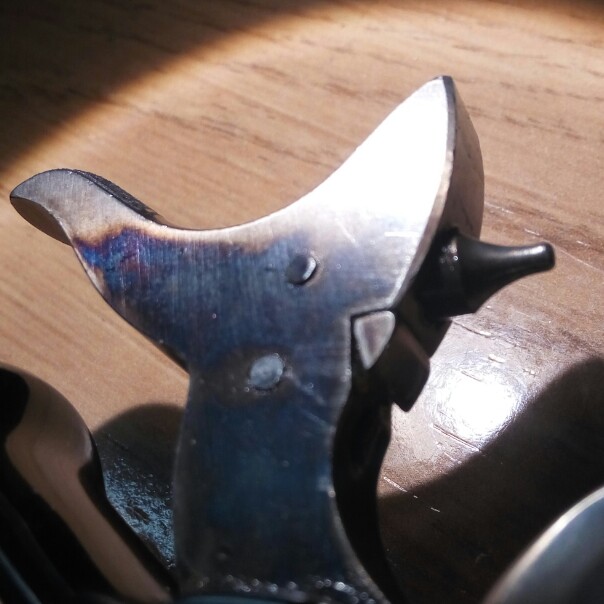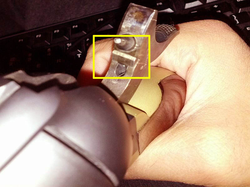 En este momento no tengo el trasto a mano para hacerle una foto, pero adjunto una que he encontrado y que muestra el "seguro" del que os hablo. El mío queda menos saliente, pero es muy similar