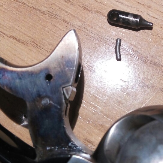 Todos los elementos móviles del martillo se desmontan sacando con un botador los pasadores que llevan, os pongo fotos de uno de ellos que tuve que sacar pues se había curvado por el uso, elongado y me estaba marcando el frame del revolver. Los pasadores, si los queréis reponer son de 2mm de diametro Saludos.