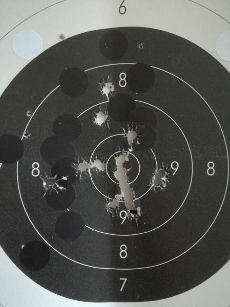 Esta vez no tengo la excusa de las cargas irregulares porque estaban pesadas a la décima de grain, y el resultado ha sido una perdigonada sobre el blanco, con la mitad de los disparos en la zona semi noble y la otra mitad de los 20 desparramados por la zona blanca a la derecha del blanco sin razón aparente alguna y lo que es peor, sin que hubiera dos juntos para poder tomar decisiones al respecto