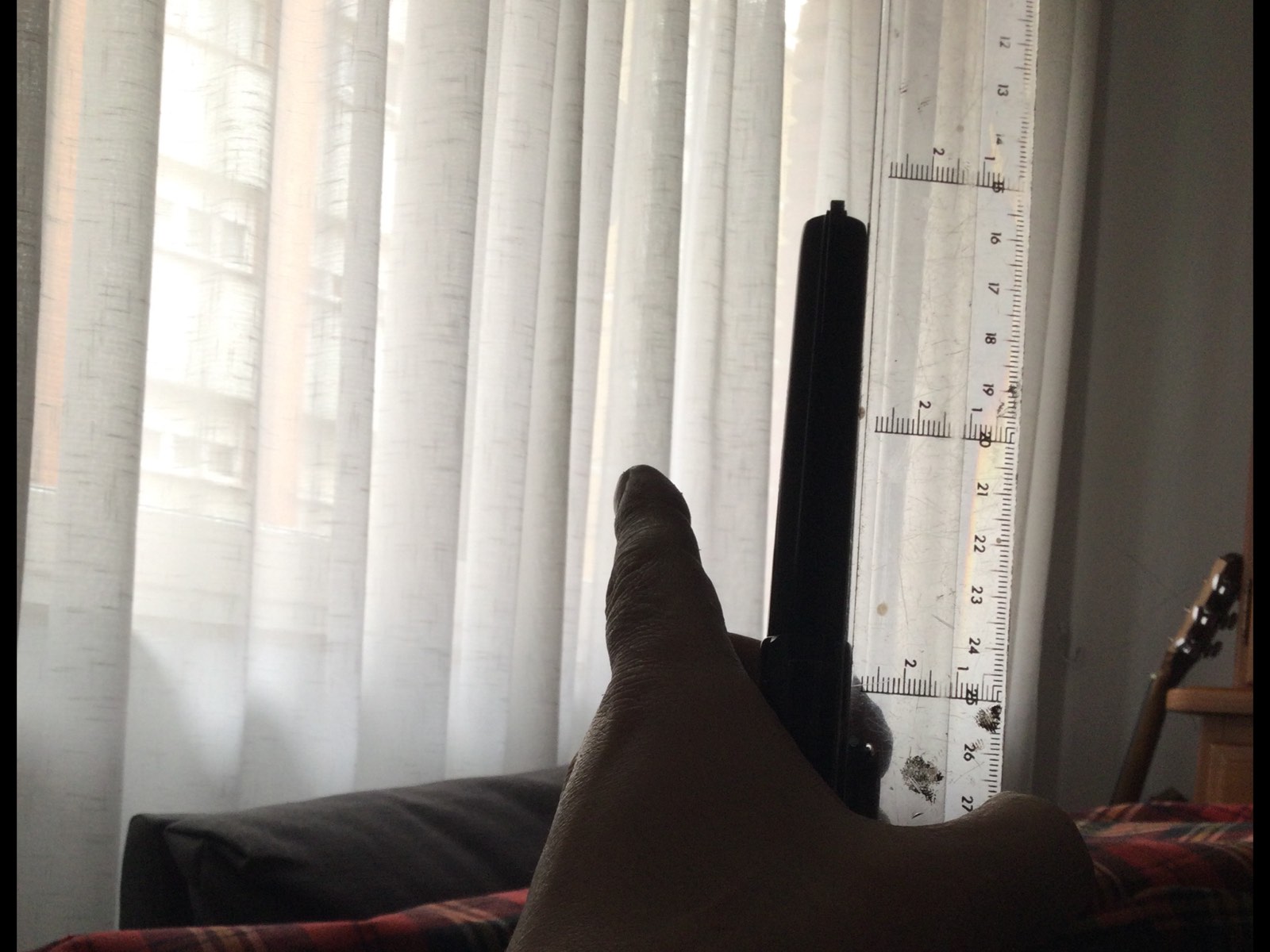 Como ejemplo, mi excelente Smith Wesson 34, del 22 lr...con su cañon desviado de fabrica a derecha.....con regla apoyada en lateral armazon como referencia....y que se ve a simple vista...que me obligo a llevar alza hacia un pelo mas a derecha de lo habitual.